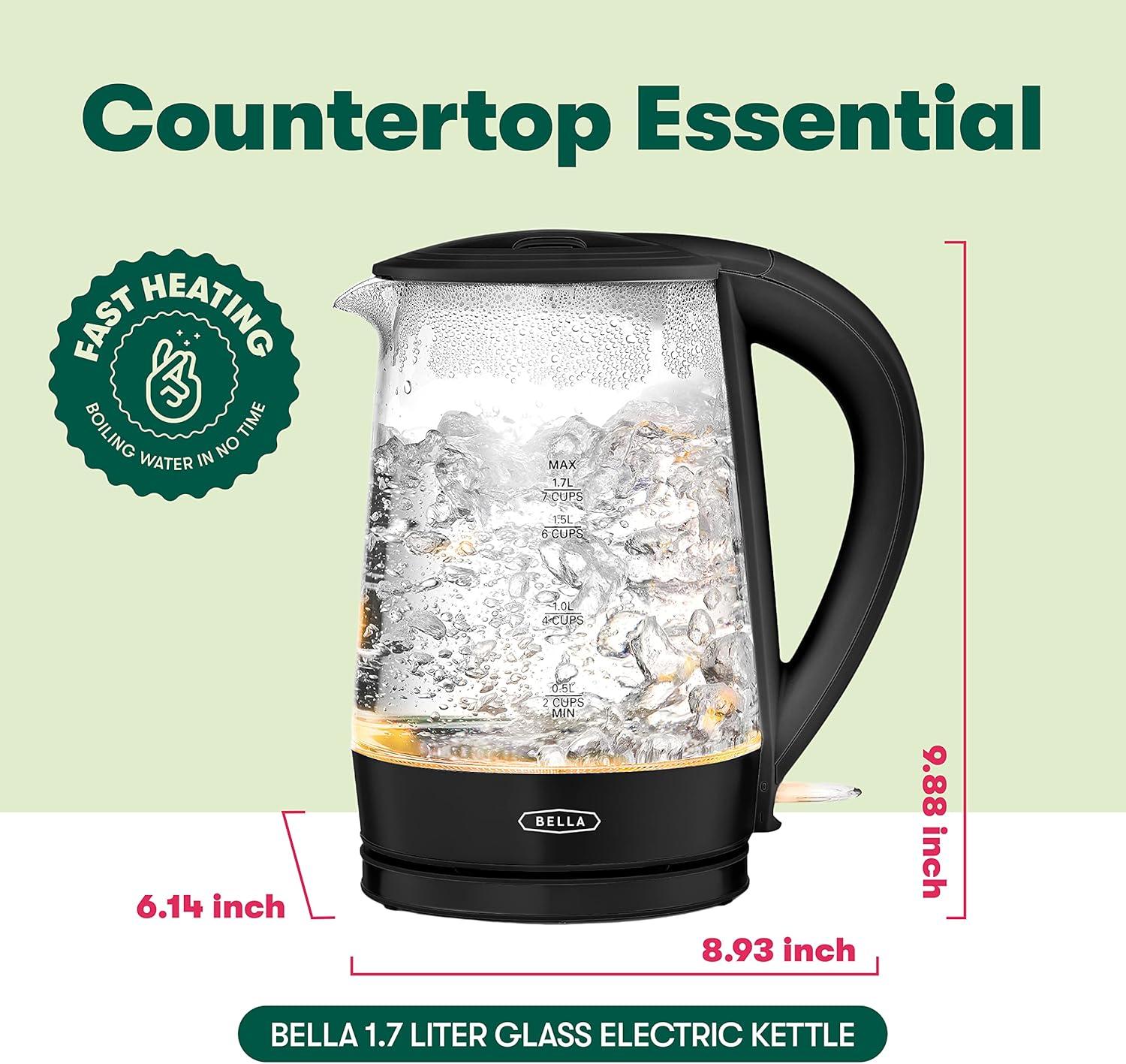 BELLA 1.7 Liter Glass Electric Kettle, Quickly Boil 7 Cups of Water in 6-7 Minutes, Soft Blue LED Lights Illuminate While Boiling, Cordless Portable Heater, Carefree Auto Shut-Off, Black(Black / Green)