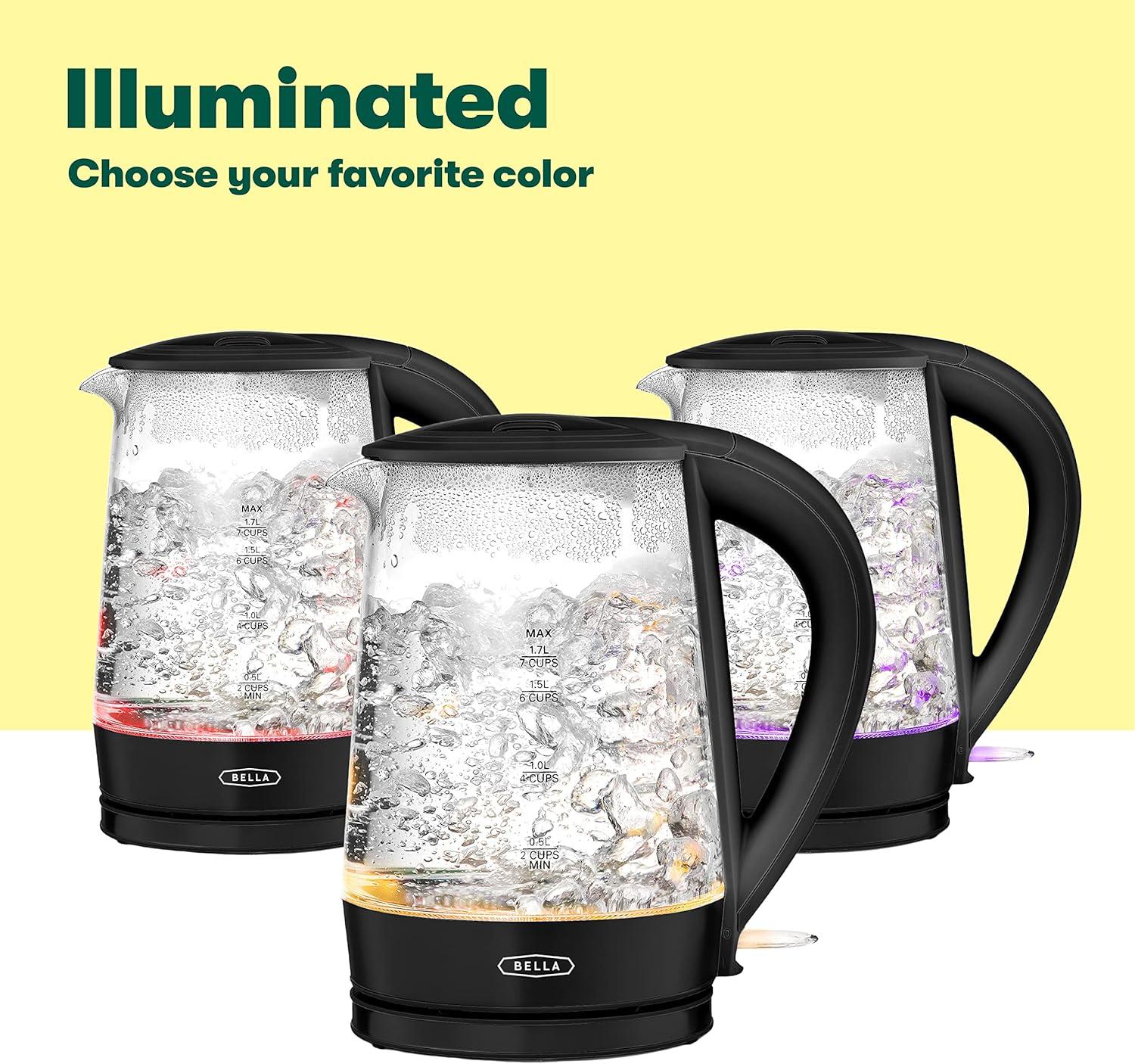 BELLA 1.7 Liter Glass Electric Kettle, Quickly Boil 7 Cups of Water in 6-7 Minutes, Soft Blue LED Lights Illuminate While Boiling, Cordless Portable Heater, Carefree Auto Shut-Off, Black(Black / Pink)