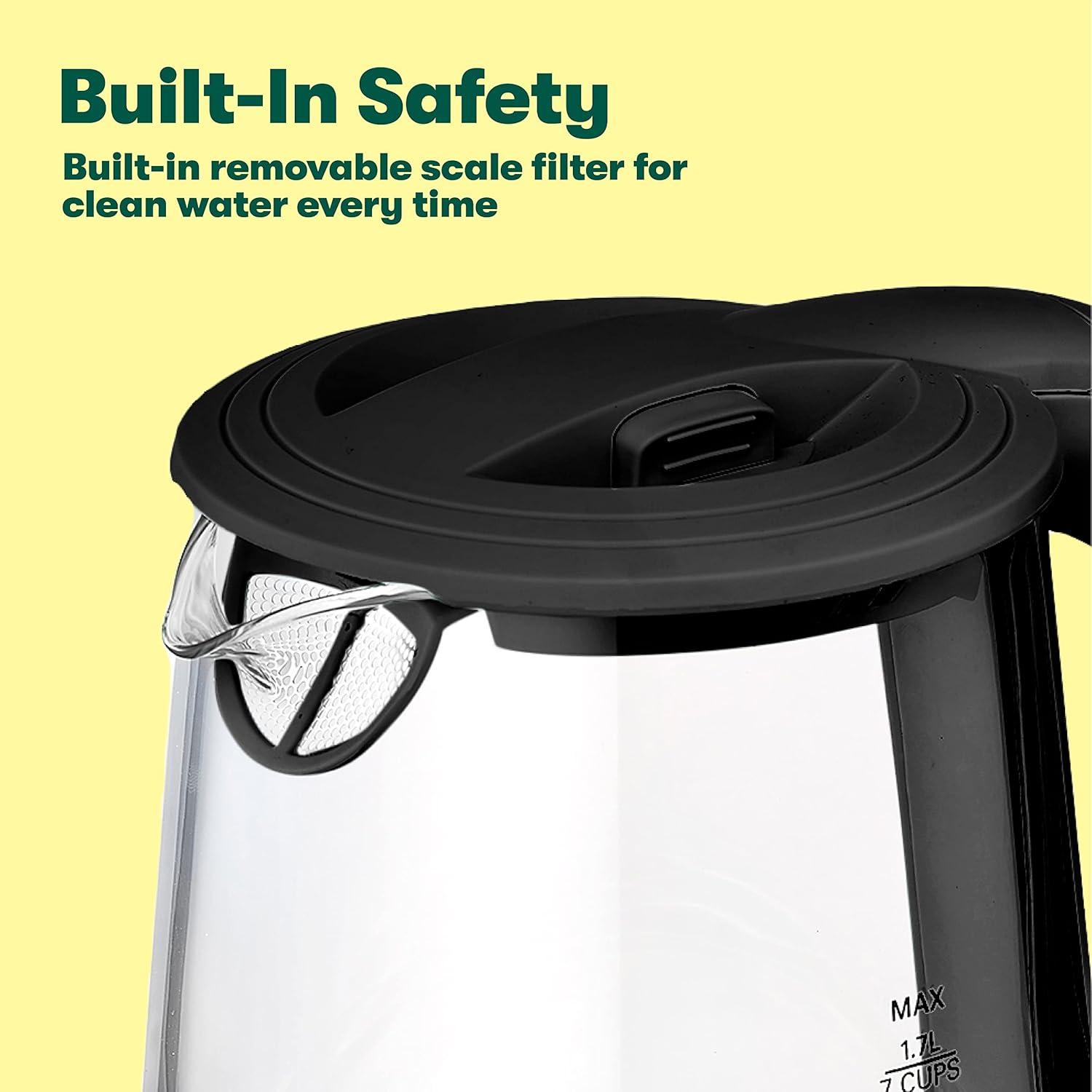 BUILT IN SAFETY: Durable borosilicate glass body combines style and functionality. This kettle features automatic shut off, boil dry protection, and a concealed heating element for maximum safety. Lid is not fully removable