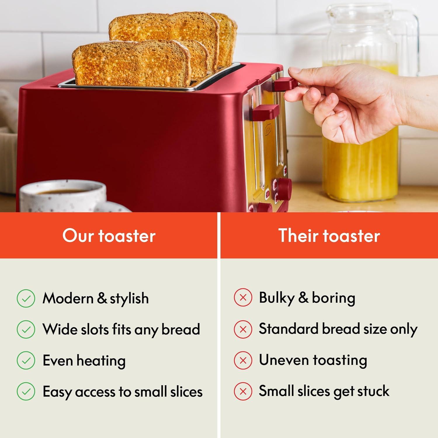 BELLA 4 Slice Toaster with Auto Shut Off – Extra Wide Slots & Removable Crumb Tray and Cancel, Defrost & Reheat Function – Toast Bread & Bagel, Black(Red)