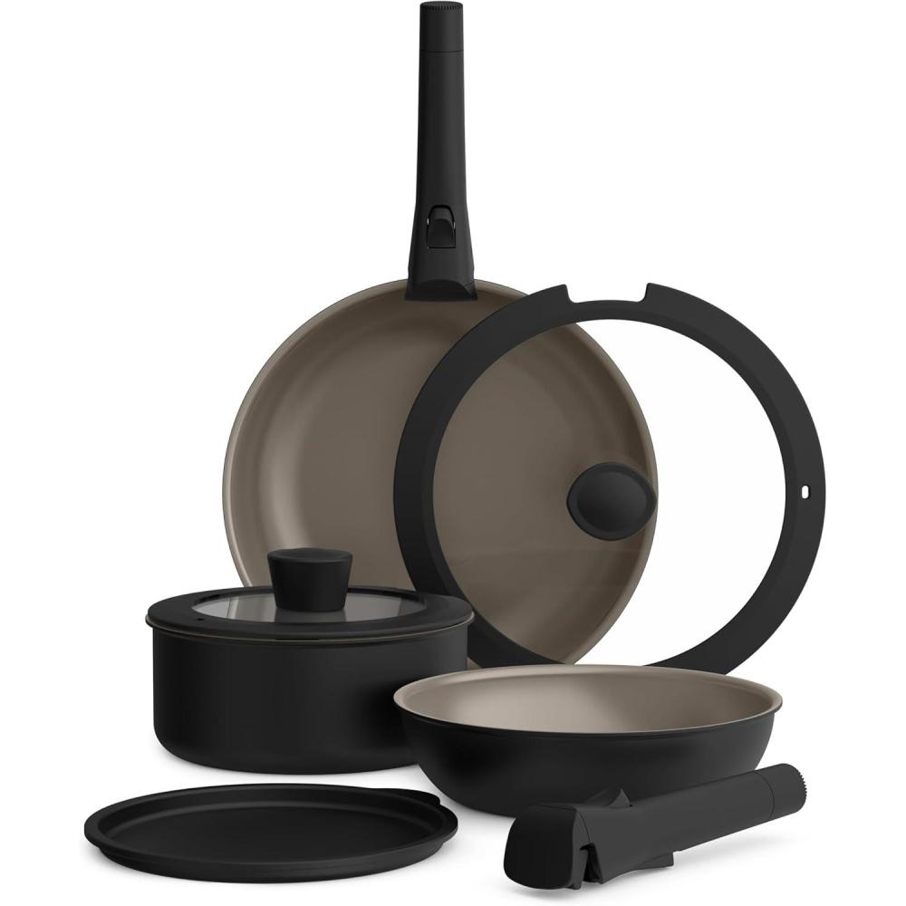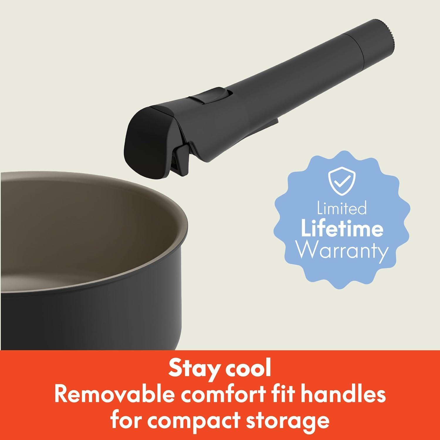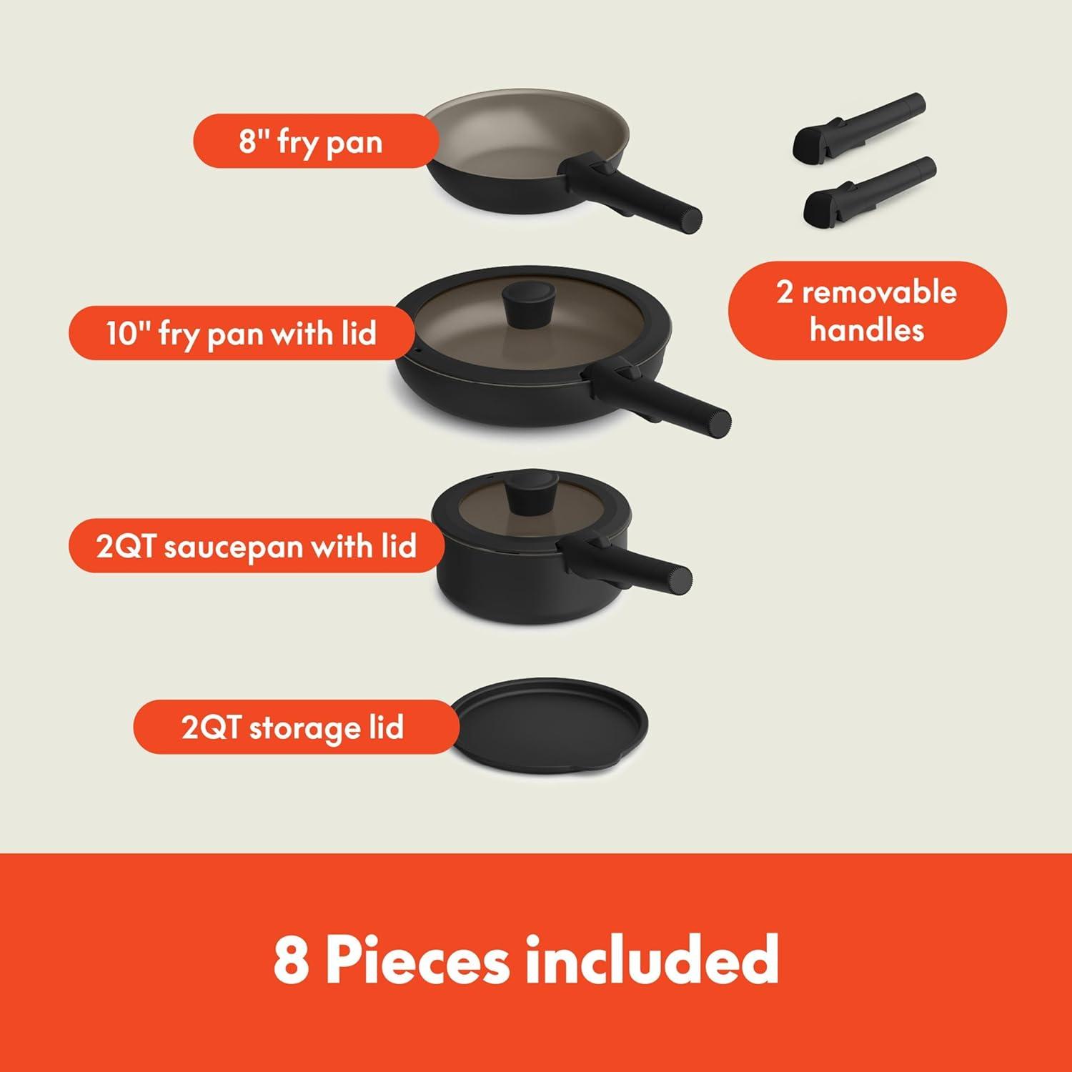 Elevate your cooking experience with this versatile nonstick cookware set, designed to bring style and efficiency to any kitchen. With fast and even heating, you'll be whipping up dishes like vibrant shakshuka, spicy Thai curries, or rich and creamy risottos in no time. The set includes an 8” fry pan, a 10” covered fry pan, a 2qt covered saucepan, a 2qt storage lid, and two removable handles—everything you need for both everyday meals and gourmet creations.