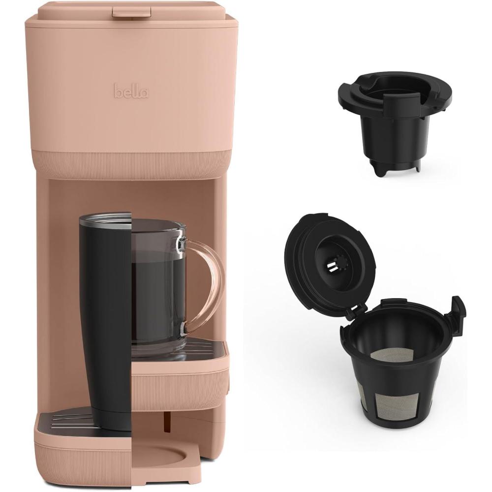 BELLA Single Serve Coffee Maker, K Cup & Coffee Ground Compatible with Removable, Adjustable Drip Tray, Auto Shutoff & Reusable Dishwasher Safe Accessories, Brews 6oz to 14oz, 1000 Watt, Blossom(Blossom)